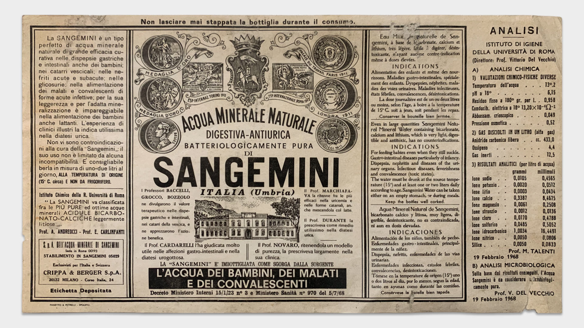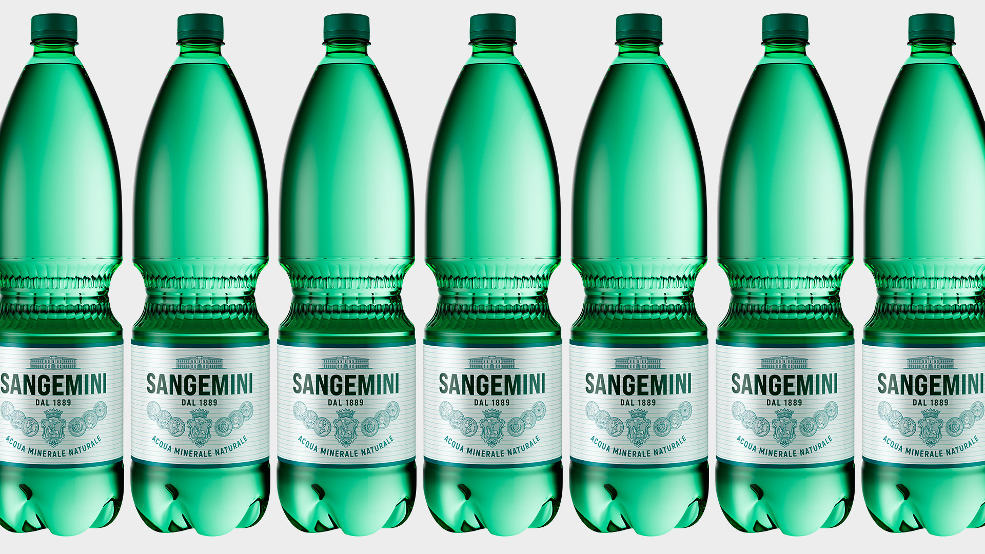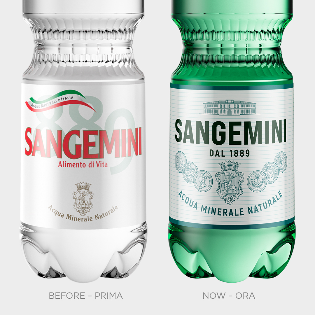 Un passo indietro Per Sangemini abbiamo fatto una inversione di rotta ispirandoci al design delle origini. Prendere ispirazione dal passato non sempre funziona: il rischio si chiama nostalgia. In questo caso però il passo indietro è servito per correggere un passo falso. Infatti, il design dei primi anni duemila ha tralasciato una bella fetta di memoria e quella di Sangemini parla di salute, una promessa del brand fin dal 1889. Abbiamo ripreso gli elementi espressivi nativi di Sangemini, li abbiamo pazientemente ridisegnati e restituiti “a nuovo”: una vera e propria operazione di restauro conservativo e qualcosa di più. A completare la manovra è stato il ritorno al verde delle bottiglie, un inconfondibile codice di Sangemini.